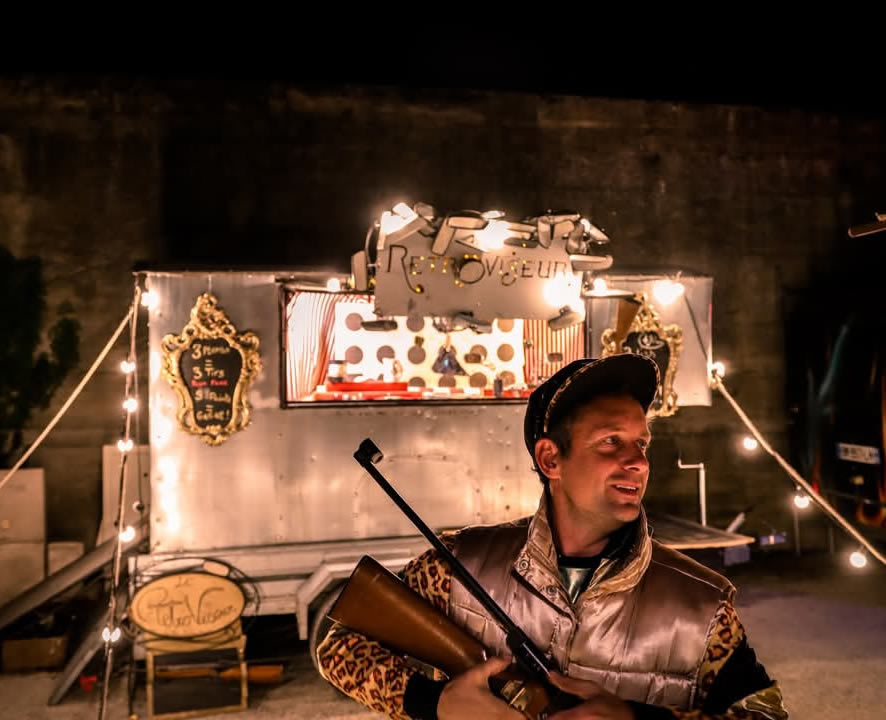 Approchez, approchez ! Venez tester votre adresse et admirer l’unique RétroCarabine connue. Avec son canon inversé et sa ligne de mire complétée d’un rétroviseur.